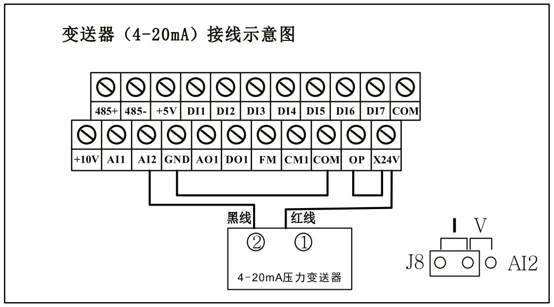 4-20mA變送器反饋模式,需要把綠色端子上的GND和COM用導(dǎo)線短接,變送器的正端接X24V(或者和X24V短接的OP),信號線接AI2。如下圖所示。